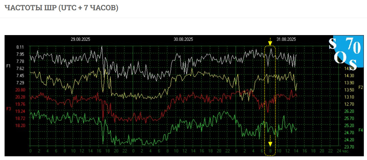 В фокусе возможные взрывы вулканов Кошелева и/ или Камбальный, исходя из сообщений ГО и ЧС по Камчатке. Аномалия частот шумана от 31 августа попадает на 01:00 , время по Гринвичу . Такая же ситуация с Т-индексом. Исходя из аномалии Т-индекса, взрыв будет мощным. Камчатское время — 13:00 01 сентября . Возможен сдвиг по времени на 13:30)) Работаем.