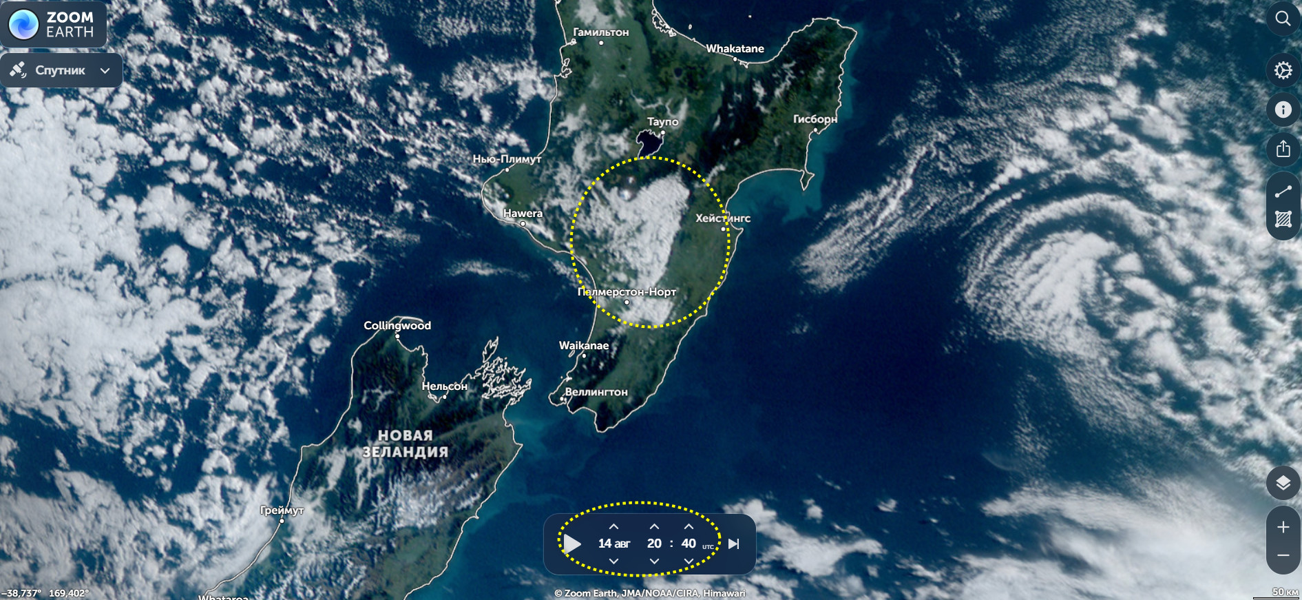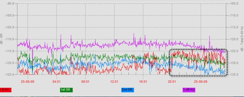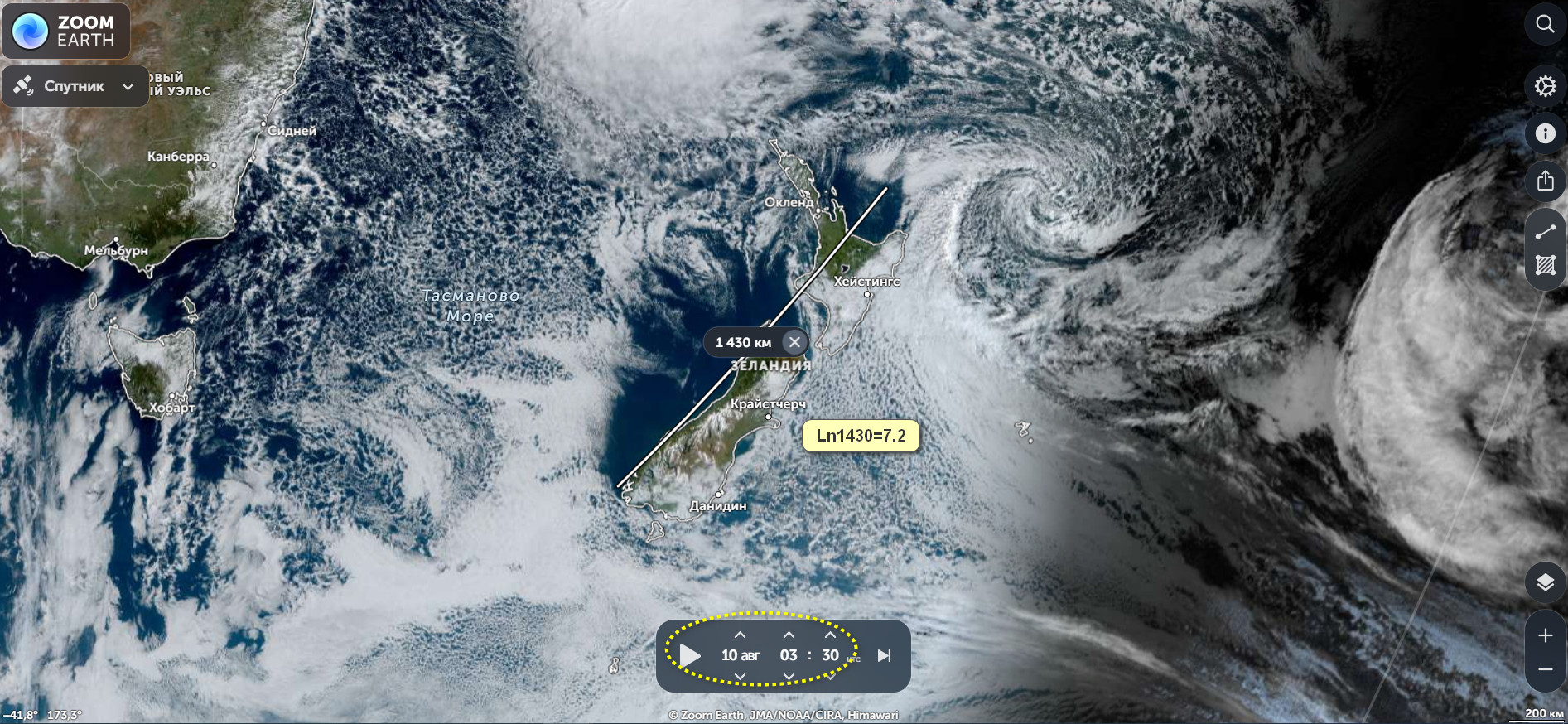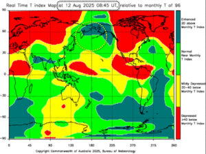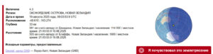 Аномальное значение амплитуд, выявлена временная метка на 08:20 по Гринвичу 19.08.2025 года. Попадает Новая Зеландия , район координат 39.5S 176E, с магнитудой М7.2.
