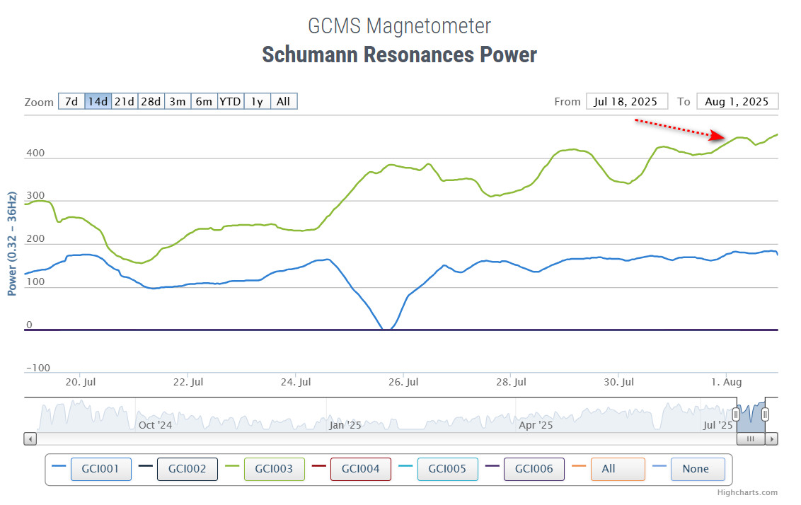 Появилось окно свободного времени , 21:15 местного, 15.08. По уровню эмф (гравитационная составляющая мпз) определилась временная метка — 08:22 по Гринвичу. Для точности использую метки Т-индекса и метки ионизации.