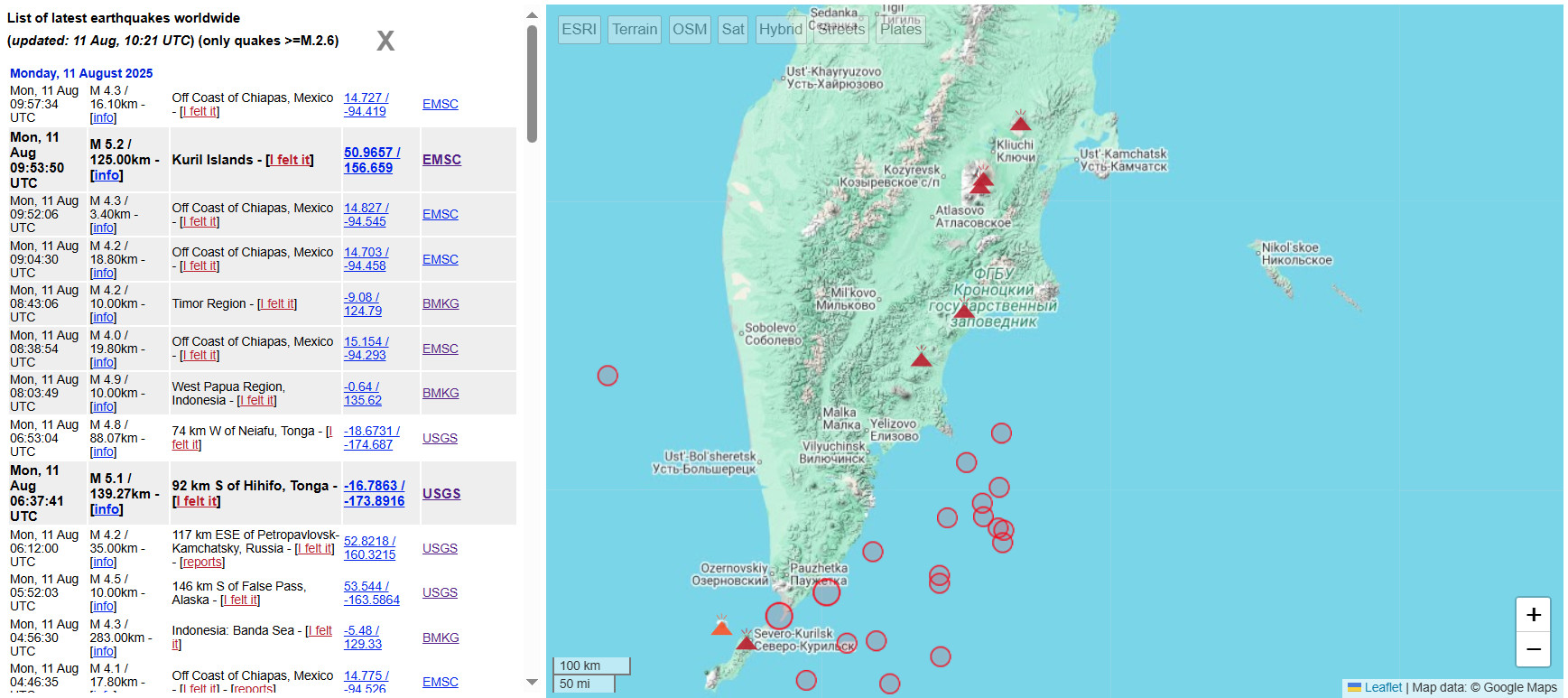 Карта активных вулканов и змт по Камчатке за последние 24 часа.