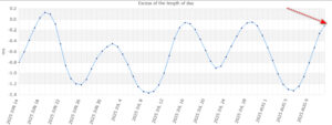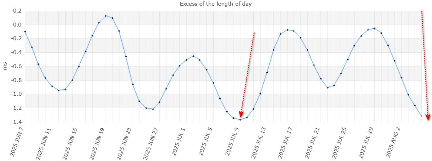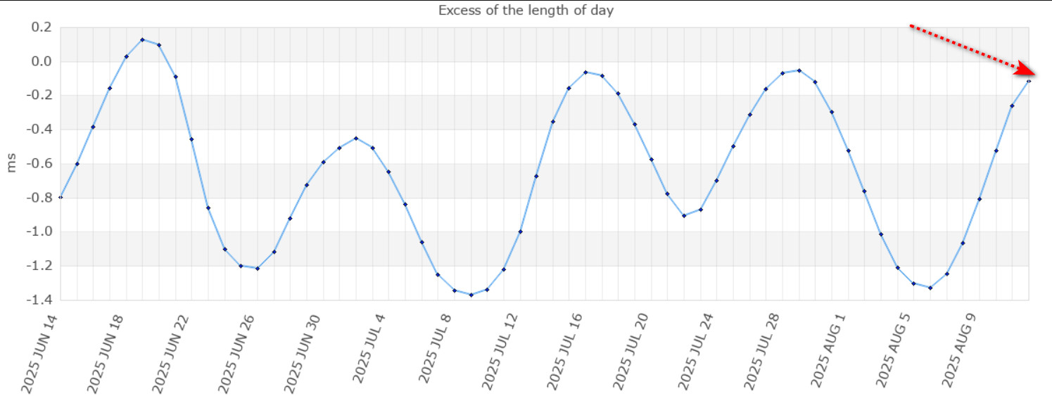 Смотрим прогнозное окно, прохождение меток до полудня 14 августа, камчатское время. Смена знака угловой скорости Земли , начало такта расширения Земли, уменьшение давления астеносферы, оболочки Земли, генерирующей частоту Шумана 7.8Гц — уменьшение активности вулканов ?