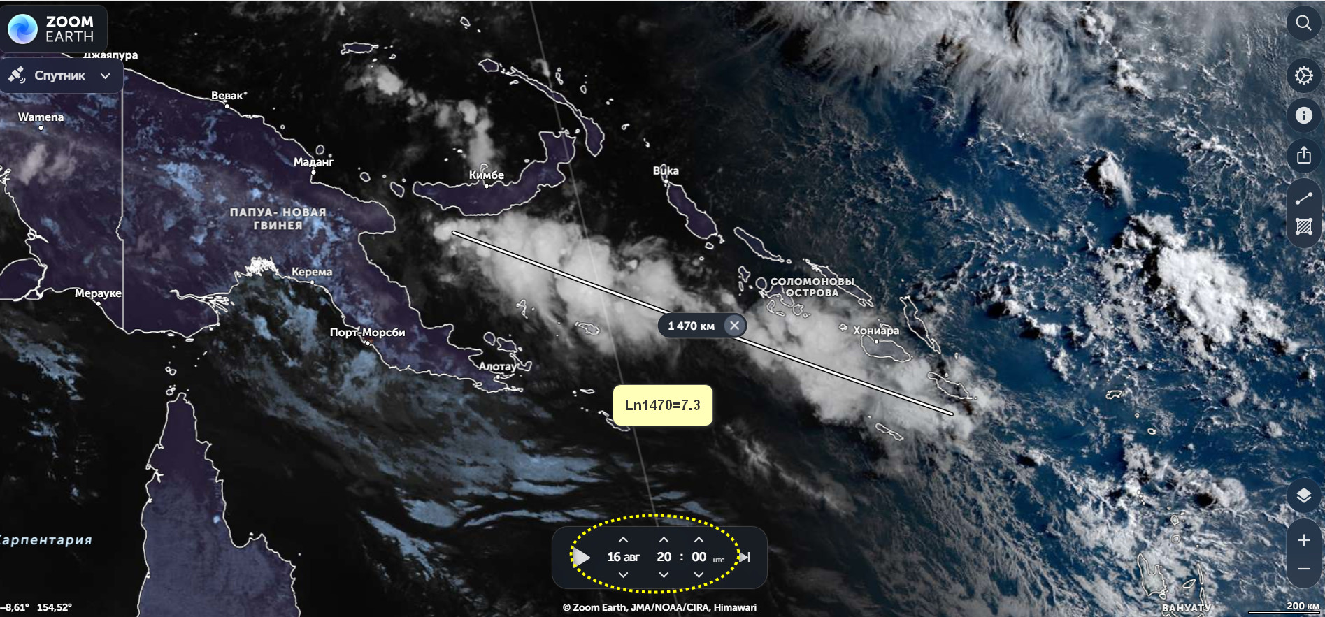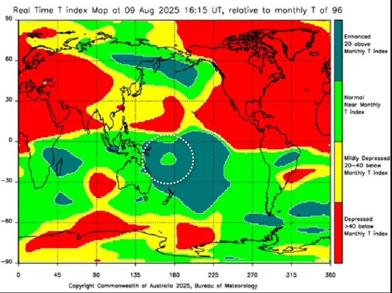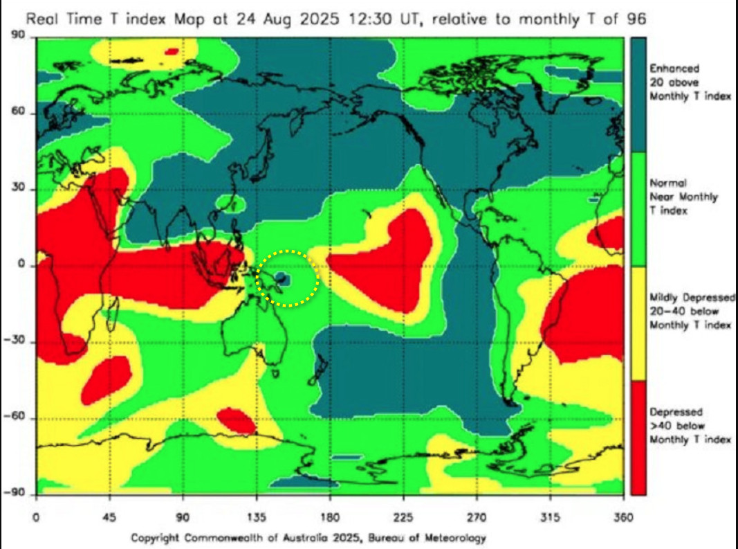 Дозвонился до Анатолия Карася, у него в фокусе на ближайшее время высветилась Папуа-Новая Гвинея. Мне было достаточно трудно определить точное время(отсутствие данных), тем не менее определил . Текущий Т-индекс высветил 2.5 часовую устойчивую метку.Итак 25.08.2025 года 11:00 по Гринвичу, район координат 3.6S 149.3E, магнитуда М7.3.