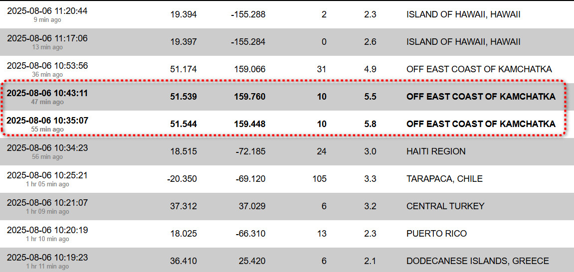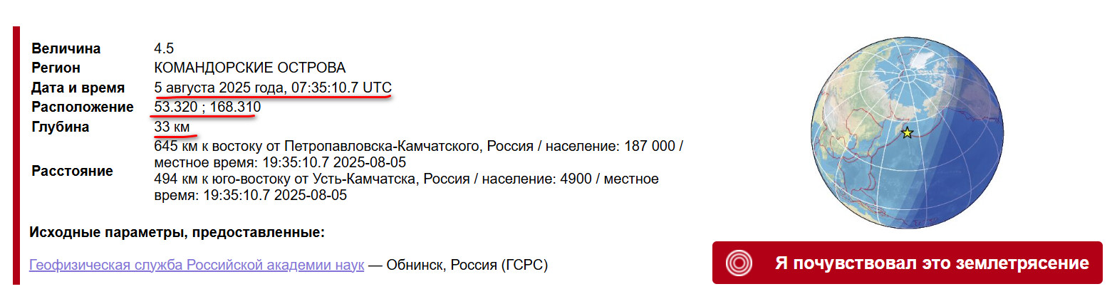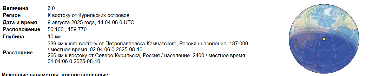Итак, Камчатка, район координат 52.57N 159.18E, 27.08.2025 года, 09:00 по Гринвичу (21:00 по местному), магнитуда М6.2 минус