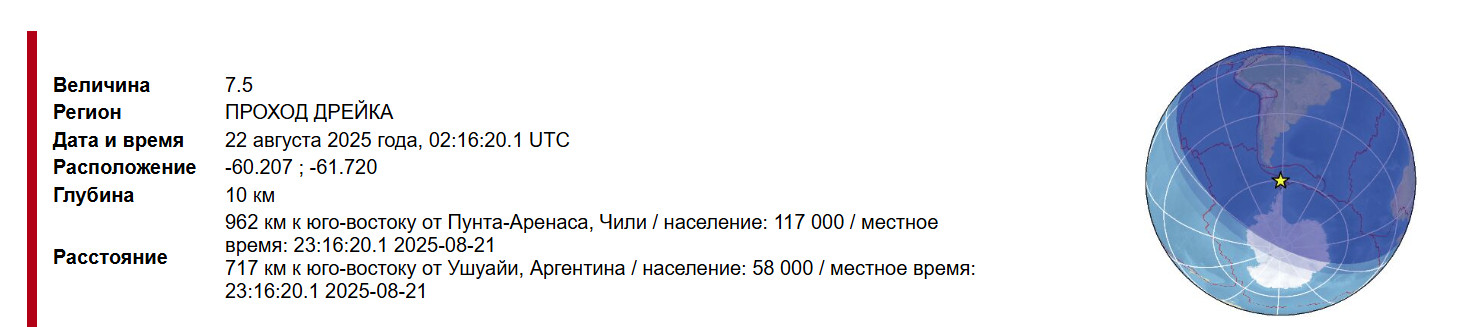На 08:22 по Гринвичу 16.08. в фокусе море Скоша, район координат 58.2S 25.5W. Магнитуда М7 МИНУС. Сейсмомагнитный меридиан от Камчатки.