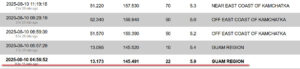 В указанном временном промежутке отработал о. Гуам, магнитуда М5.9.По Камчатке прозвучала серия из трёх пятёрок. Воскресенье отдыхал, расшифровками не занимался))