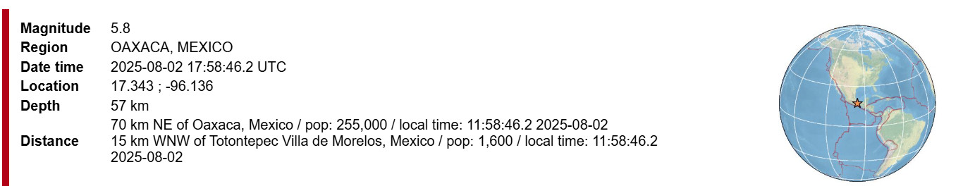 Был прогноз на второе окно , 7 августа. С минимальной погрешностью отработало место и время, магнитуда оказалась ниже прогнозируемой, парное событие М5.2. и М5.8. Но это то-же результат, алгоритм отработал.