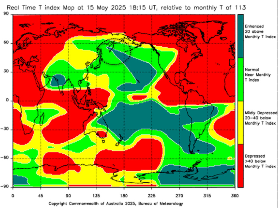 Прошли две суточные метки, по Т-индексу — 13:00 по Гринвичу, по сверхнизким частотам — 13:30 Гринвича. Погрешность в синхронизации функций составила 30 минут. Тем не менее обозначился район предполагаемого события. Ждём прохождение суточной метки 16 мая , в районе 04:42->04:52 по Гринвичу. Как то так)))