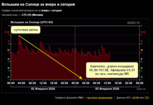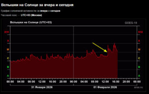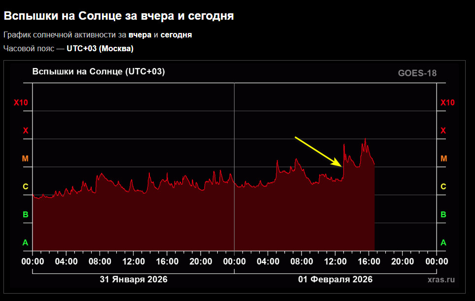 Вспышка уровнем M6.6 ,группа пятен 4366, на 09:53->10:06 по Гринвичу 01.02. Передний фронт вспышки имеет скачкообразный максимум. По изучаемым полям, в том числе по магнитным силовым трубкам, опорным событиям,отметилось побережье Мексики. ОСТИ тянет на магнитуду М7.1, 02.02.2026 года, 09:53->10:06 по Гринвичу, район координат 15.7N 99.7W. Будем посмотреть.