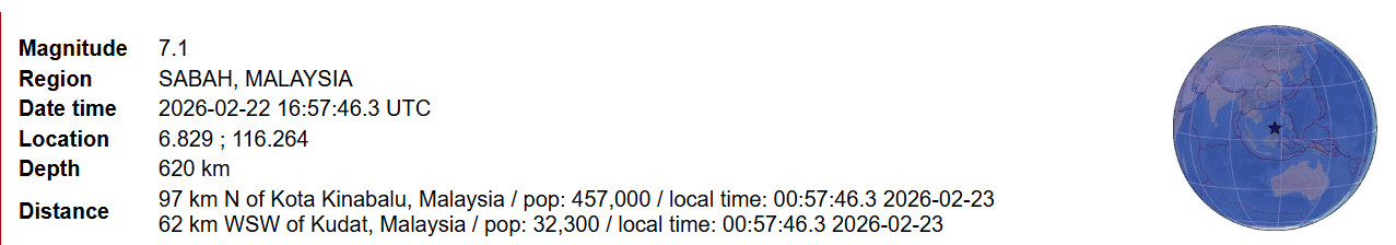 Продолжение по Малайзии , на 24.02.2026 года, в районе 21:00 по Гринвичу, в районе координат 7N 115.8E, ожидаю афтершок магнитудой M6.7. При не прохождении события в течении 20 минут, угроза снимается.