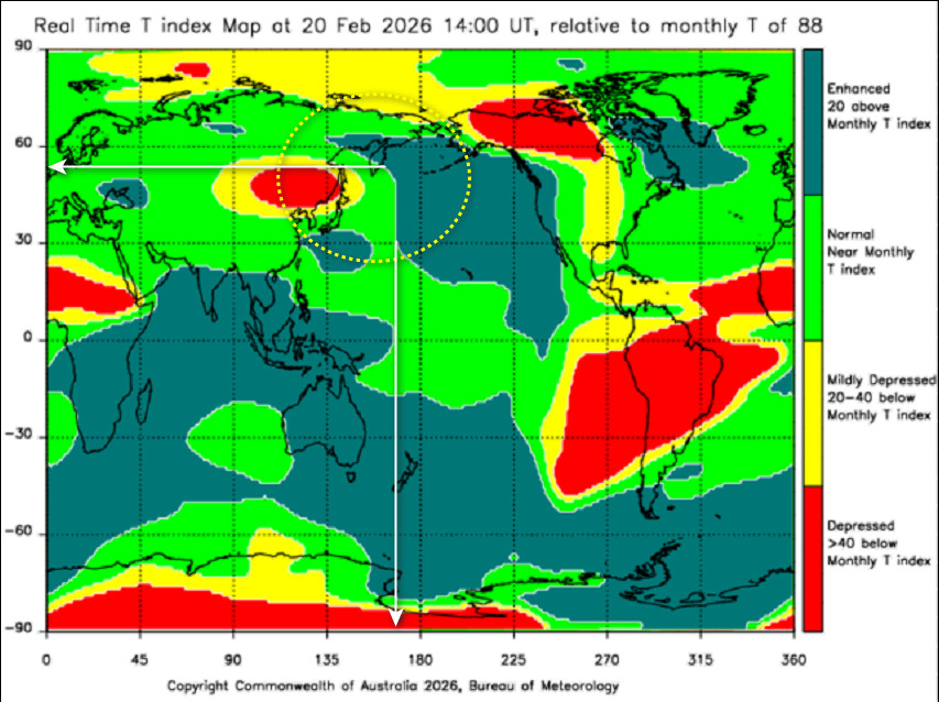 Накладка по времени — праздники. Тем н менее в фокусе район координат 60.2S 154.6E- между Антарктидой и Новой Зеландией. 22.02.2026 года, 18:05 по Гринвичу, магнитуда М7.1. При не прохождении прогноза в течении 20 минут — угроза снимается.