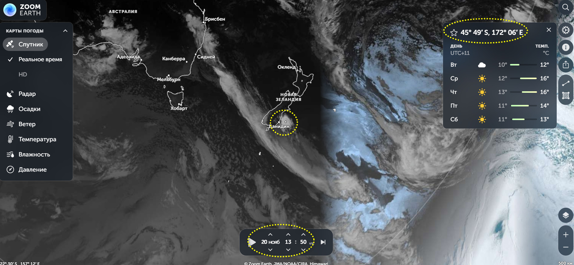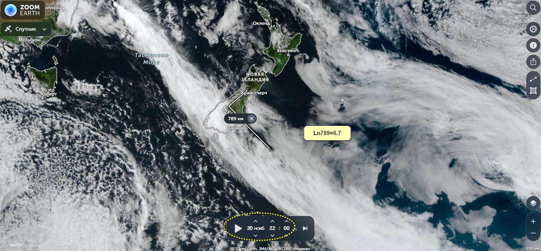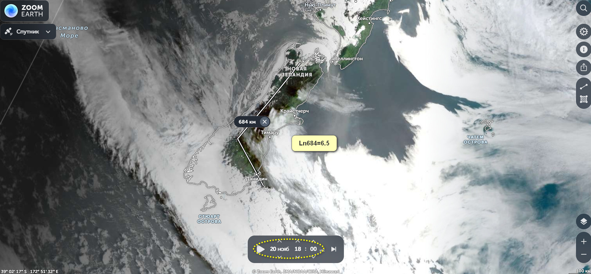 Прогноз по Новой Зеландии завершился отработкой маркерного события на указанном меридиане, немного севернее указанного района. Погрешность по времени составила два часа.