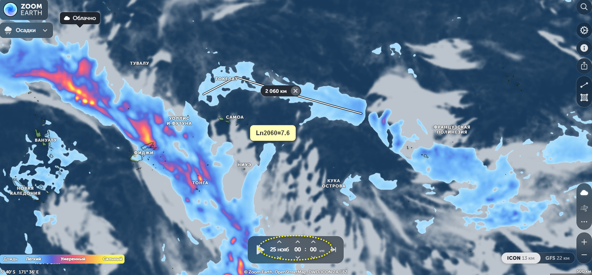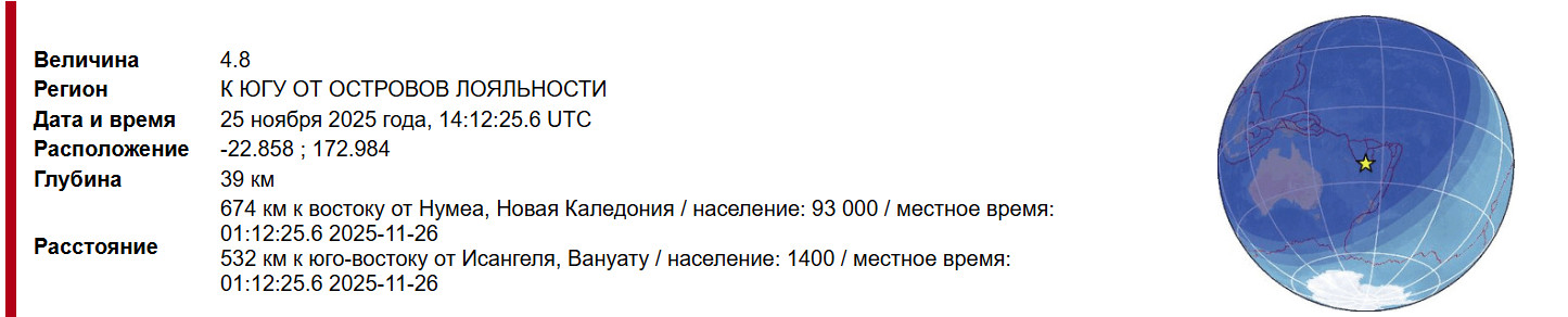 На 27.11.2025 года 06:15—>06:36 по Гринвичу в фокусе Самоа, район координат 9.45S 173.3W, магнитуда М7.6. При не прохождении прогноза в течении 20 минут, угроза снимается.