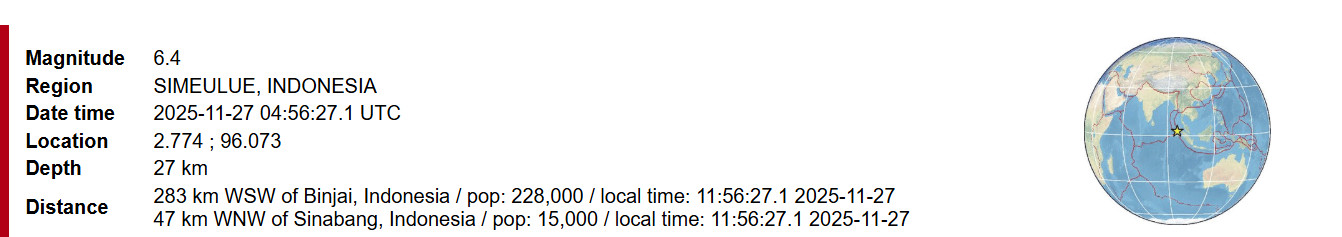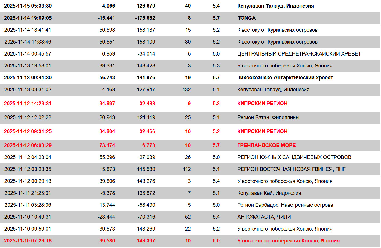 В фокусе 26.11.2025 года, 02:16 по Гринвичу, юго-западная Суматра, район координат 7.1S 104E, магнитуда М8 ПЛЮС. После его прохождения в северном полушарии наступит календарная зима. Будем посмотреть.))