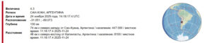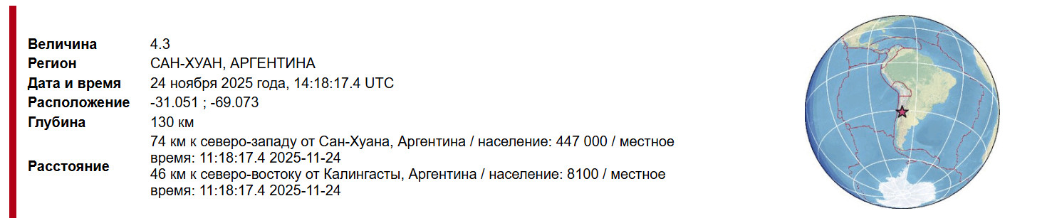 В фокусе Аргентина, район координат 43.8S 71W, 30.11.2025 года, 21:56 по Гринвичу, магнитуда М6.8. При не прохождении прогноза в течении 20 минут, угроза снимается.