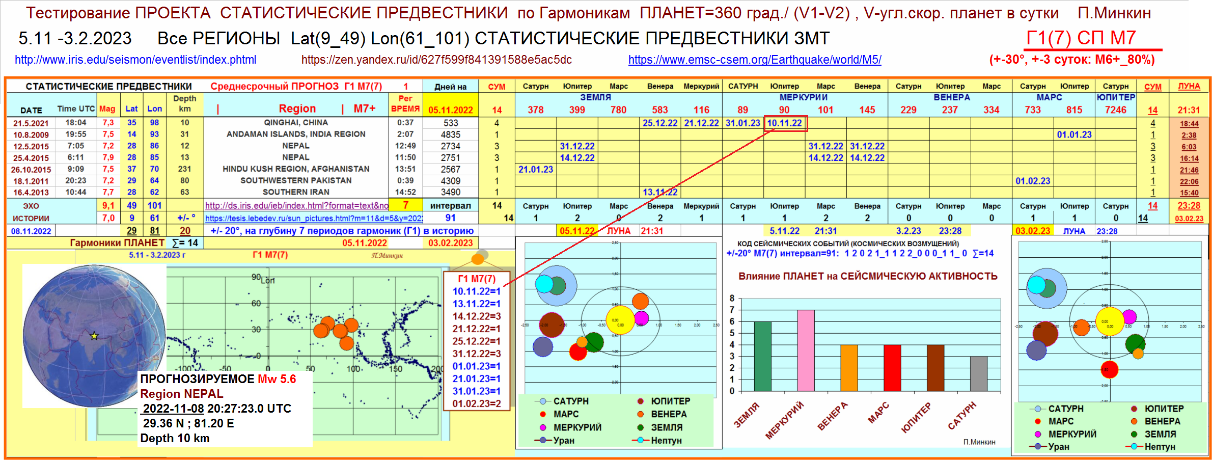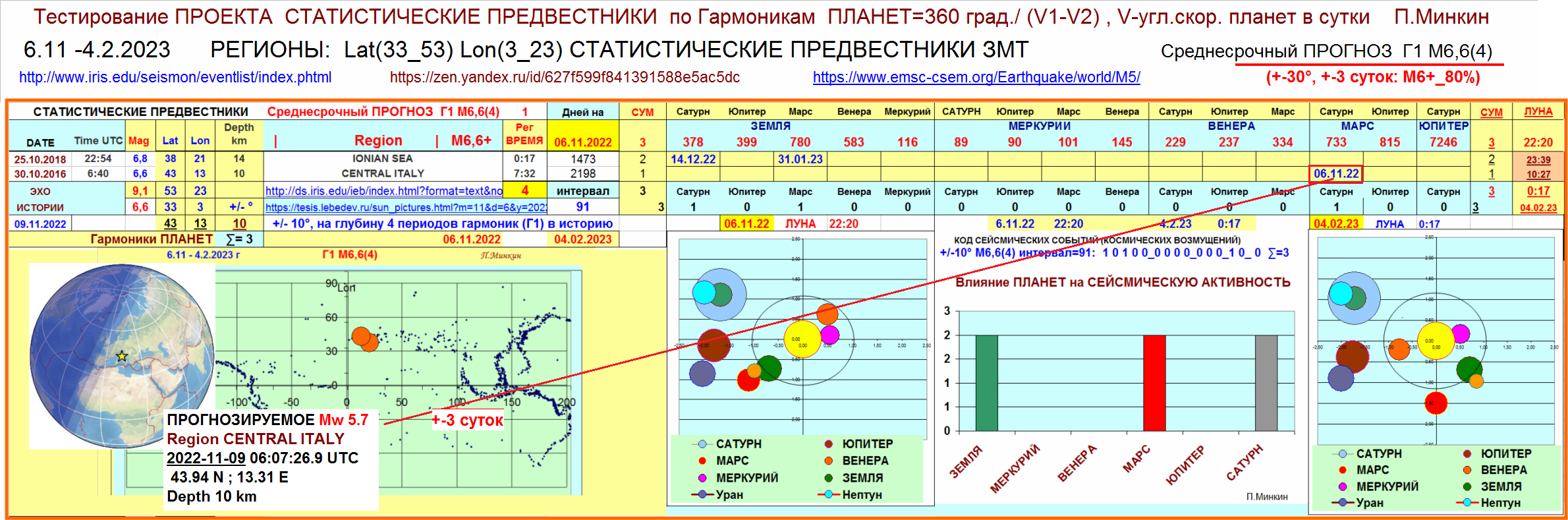Прогнозный меридиан отметился в предыдущем прогнозе от 08.11.2022 года. Широту выдали опорные события по Андреяновским островам, Камчатке ,гармоники : Г-202,188,104,21,7. Также Камчатку указывал Пётр Минкин.